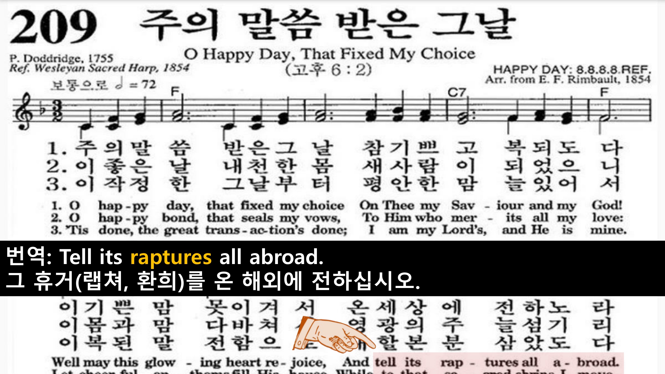 할렐루야, 호산나, 마란아타, 바룩하바 베쉠 아도나이, 환희, 해피, 랩처, 낱쌀, 하르파조!
