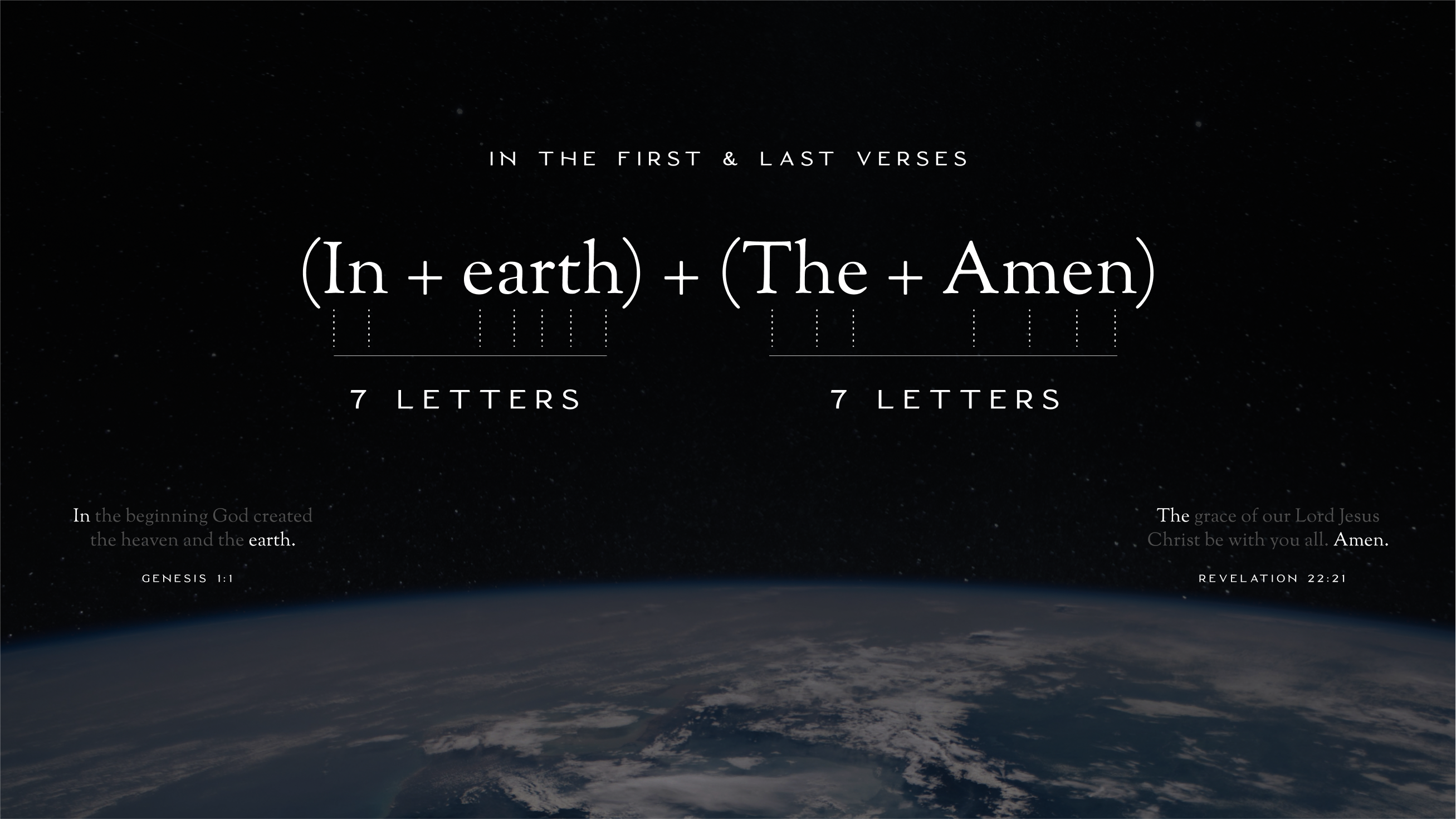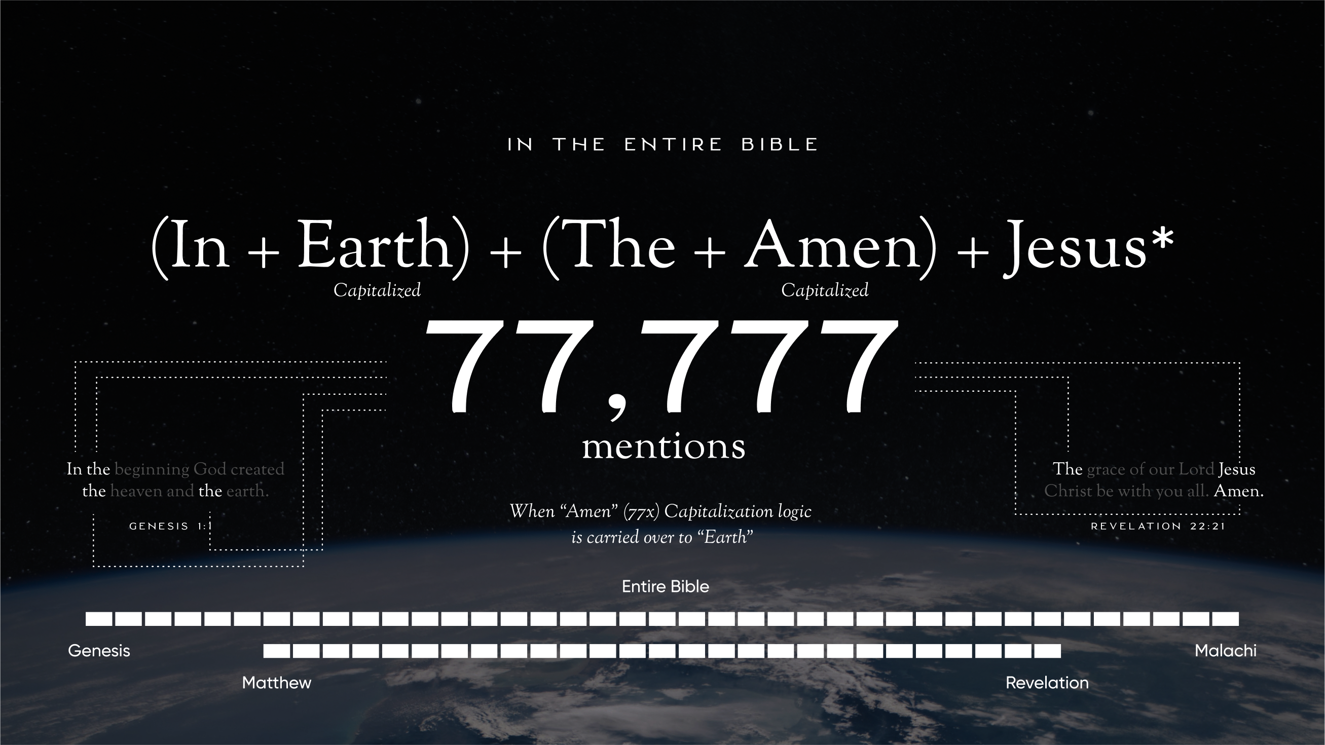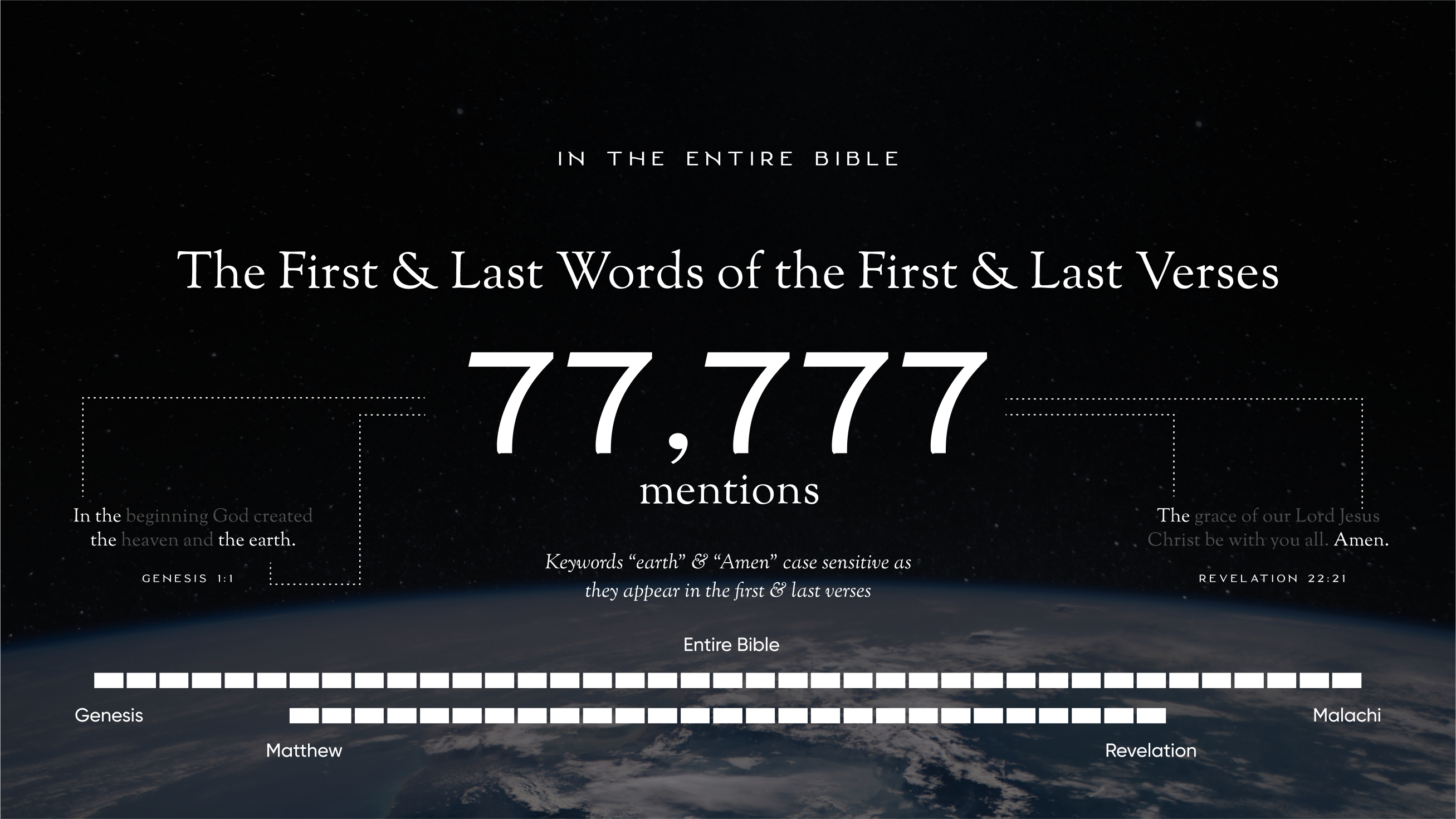 About Video Comparison Discussion 5 Summary Imagine that every time you see the words “in” or “the” or “earth” or “Amen” in the Bible, you are microscopically zoomed into a signature that God has intricately woven throughout 25,000+ verses