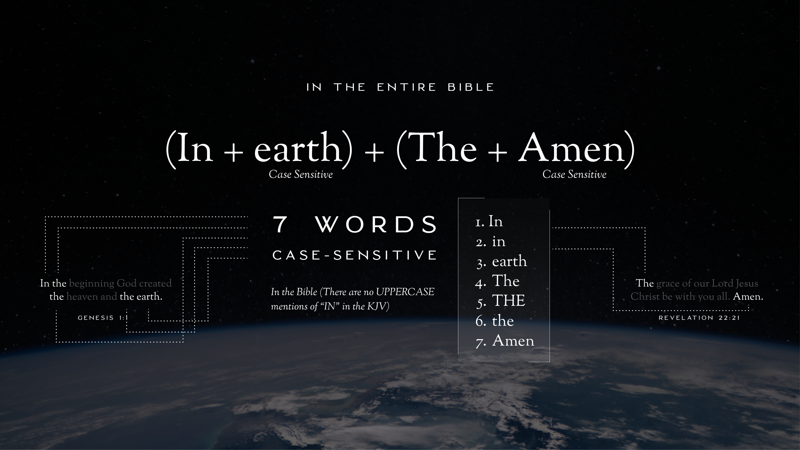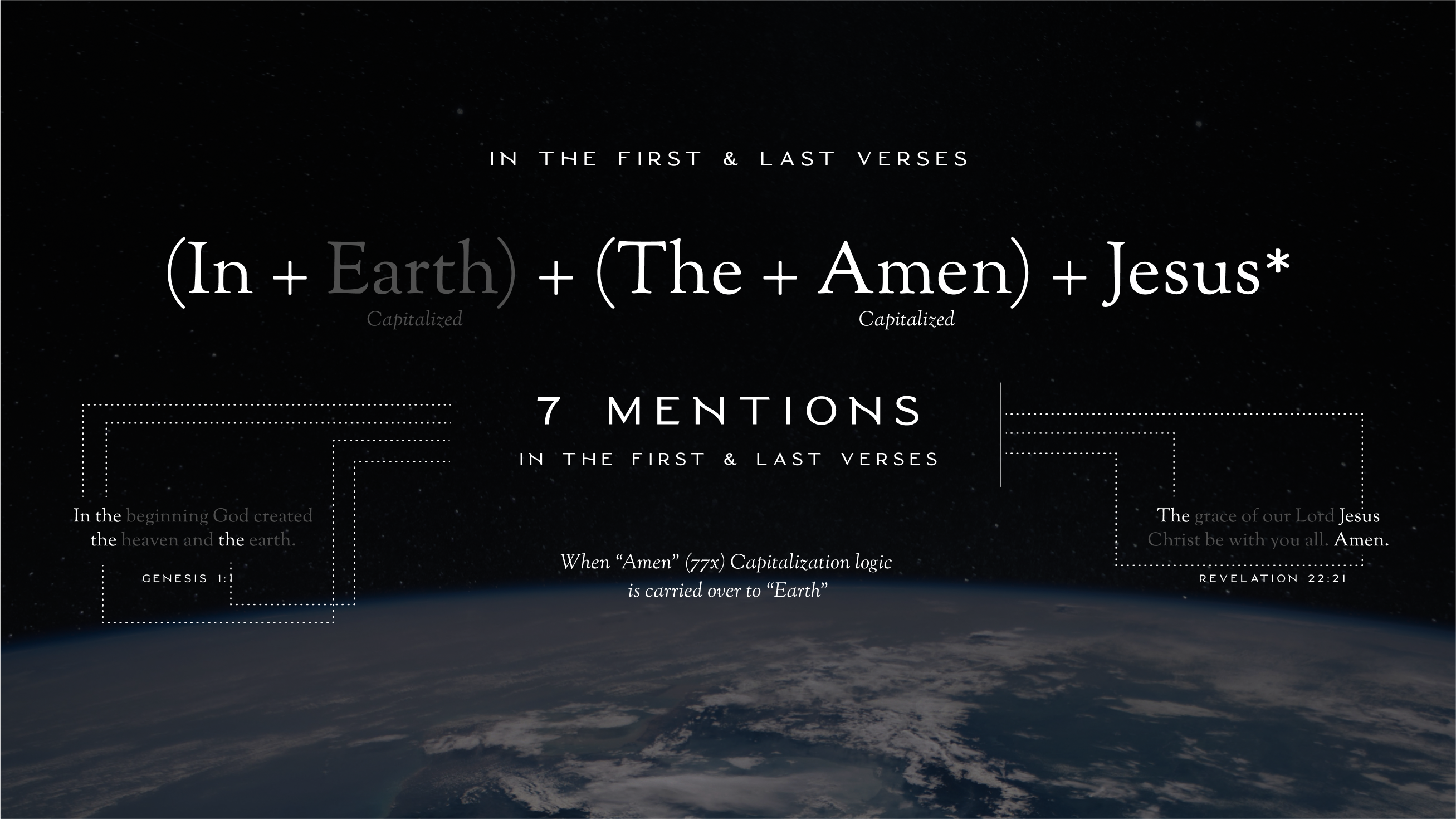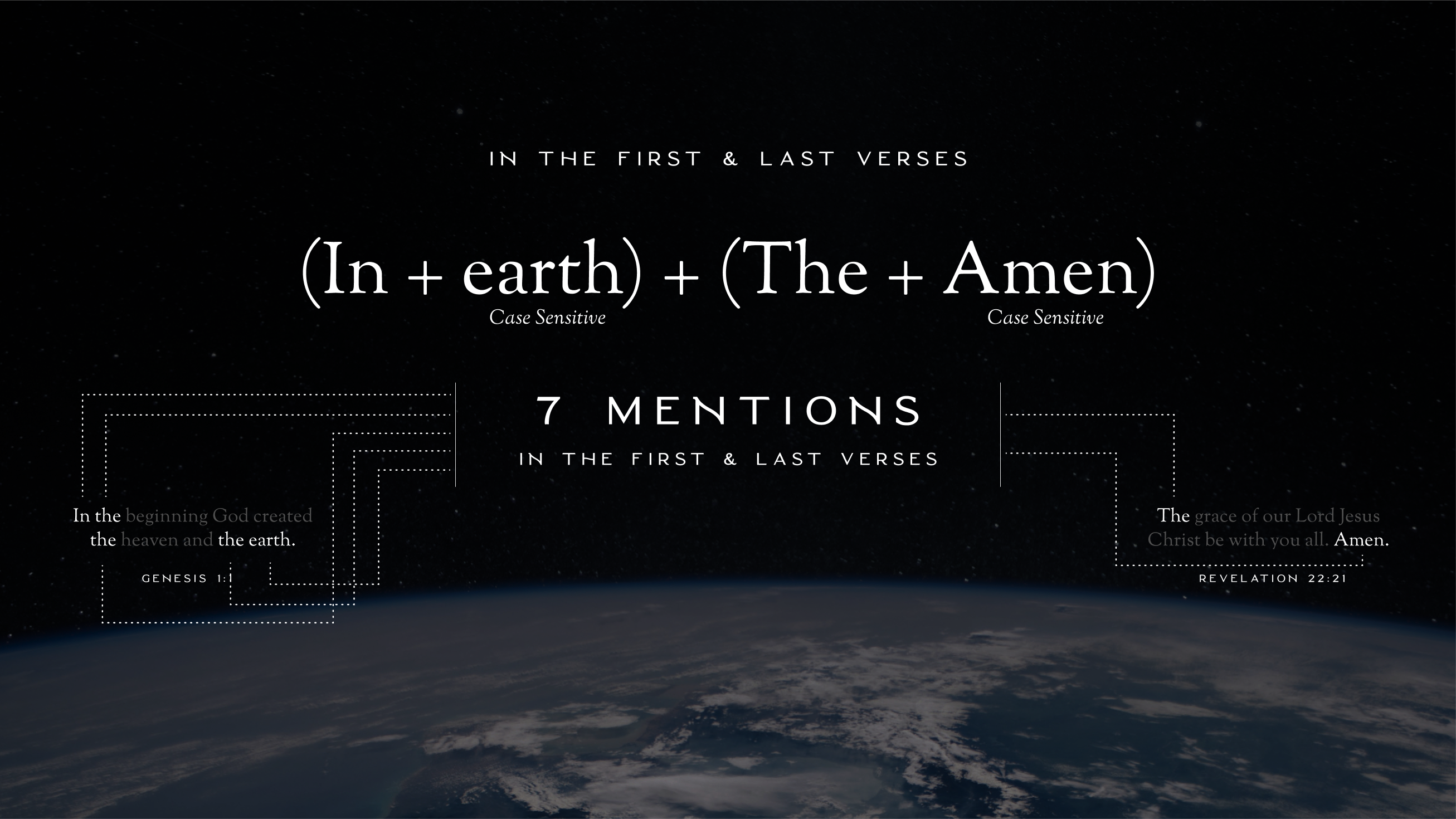 About Video Comparison Discussion 5 Summary Imagine that every time you see the words “in” or “the” or “earth” or “Amen” in the Bible, you are microscopically zoomed into a signature that God has intricately woven throughout 25,000+ verses