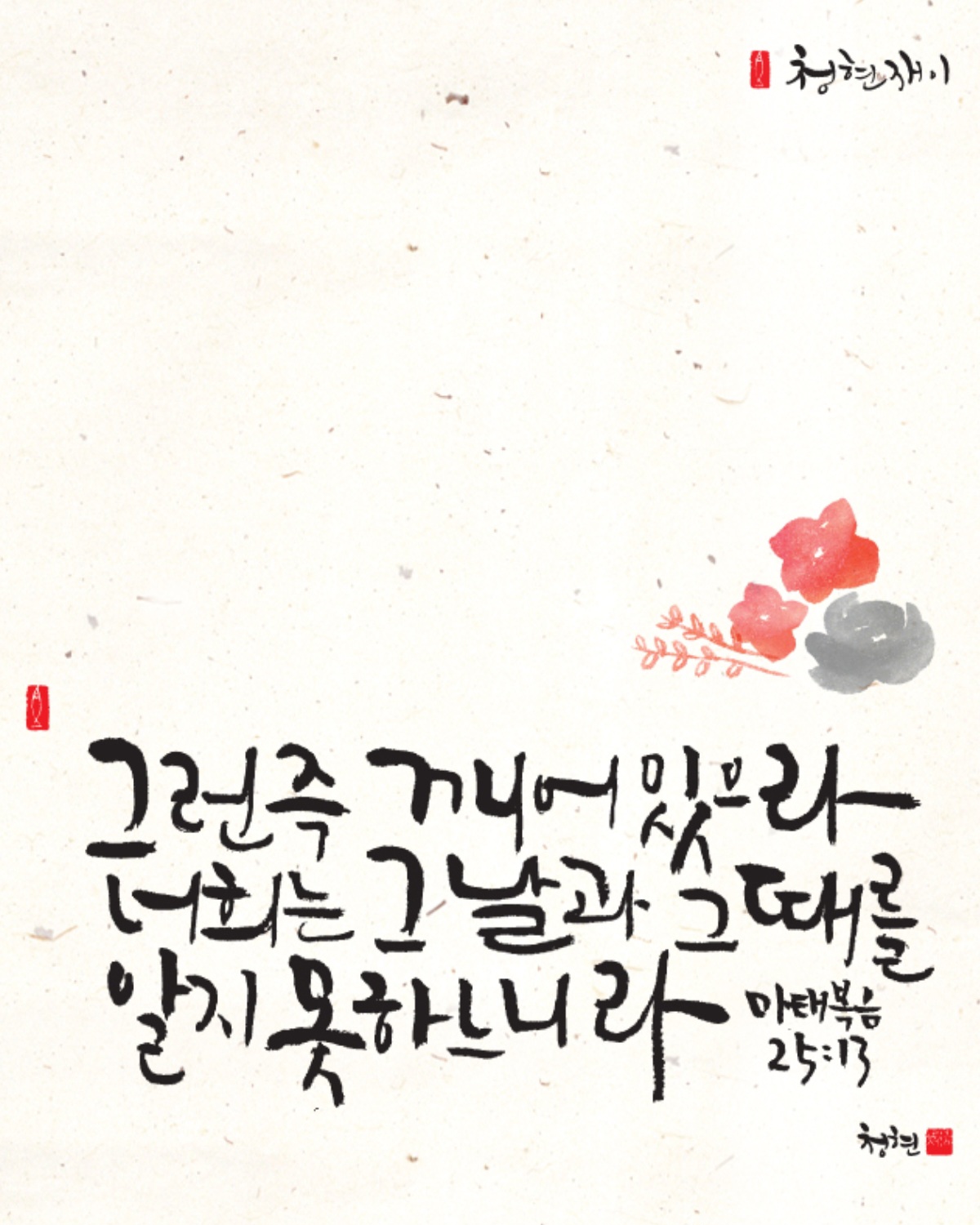 그런즉 깨어 있으라 너희는 그 날과 그 때를 알지 못하느니라 (마태복음 25:13)청현재이(淸炫才怡)는 하나님께서 주신 '맑고 밝은 재주 캘리그라피를 하나님의 기쁨을 위해 사용한다'는 의미입니.