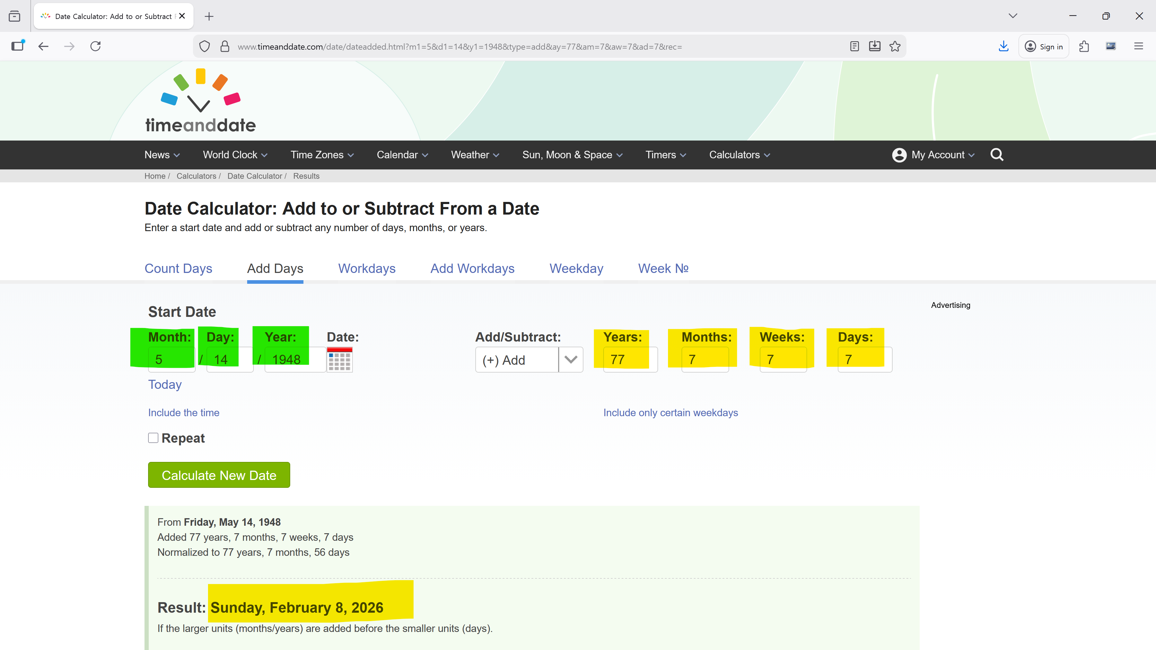 From Friday, 14 May 1948 Added 77 years, 7 months, 7 weeks, 7 days Normalized to 77 years, 7 months, 56 days Result: Sunday, 8 February 2026 If the larger units (months/years) are added before the smaller units (days). Alternative result: Monday, 9 Februar